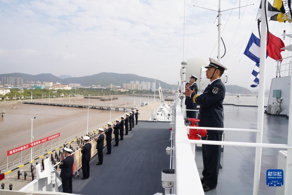11月2日,执行“和谐使命-2022”任务的中国海军“和平方舟”号医院船从浙江舟山某军港解缆起航。这是欢送仪式现场。