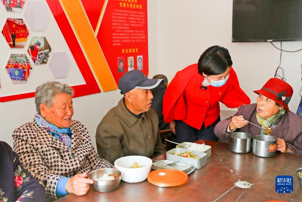 11月1日,在沈阳市苏家屯区解放街道金山社区爱心公益食堂,吴书香和就餐老人交流。爱心公益食堂免费向社区及周边70岁以上有需求的老人提供午餐。