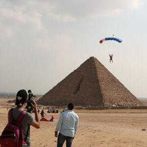 当日,第五届金字塔国际跳伞节在埃及首都开罗附近的吉萨金字塔景区开幕,吸引了来自世界各地的100余名专业跳伞运动员参加。