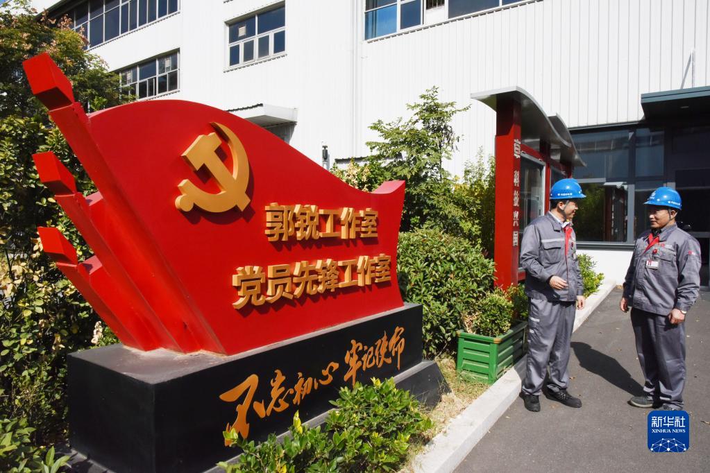 11月2日,在中车青岛四方机车车辆股份有限公司郭锐工作室外,郭锐(左)在与工友交流。