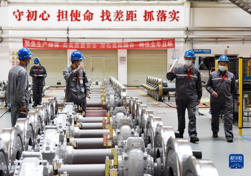 11月2日,在中车青岛四方机车车辆股份有限公司转向架分厂车间,郭锐(右二)与工友相互致意。