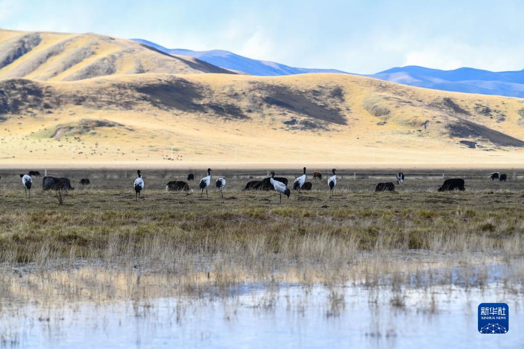 一群国家一级保护动物黑颈鹤在四川省阿坝藏族羌族自治州若尔盖县的湿地活动(2022年10月17日摄)。