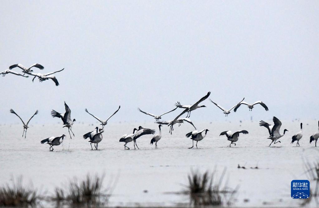 11月4日拍摄的在贵州草海栖息的国家一级保护动物黑颈鹤。