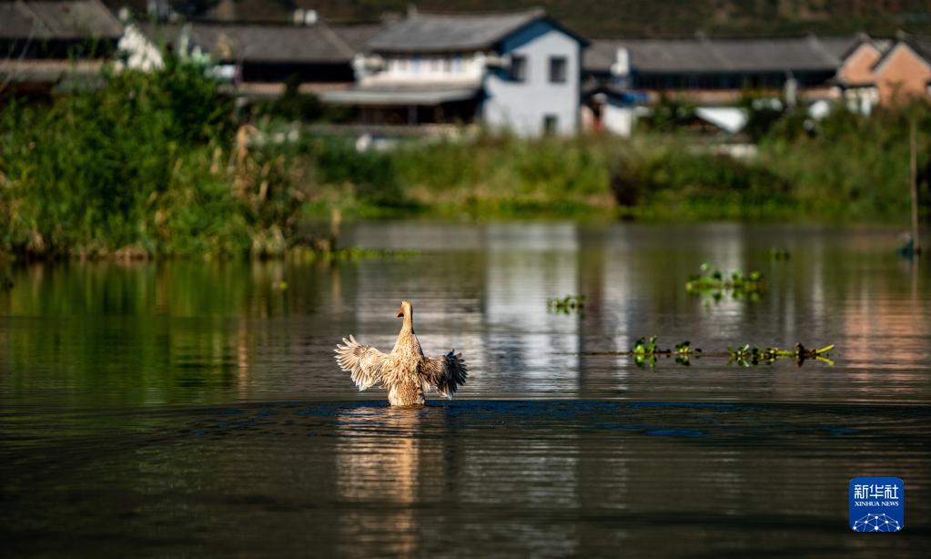 鸭子在西湖国家湿地公园嬉戏(10月27日摄)。