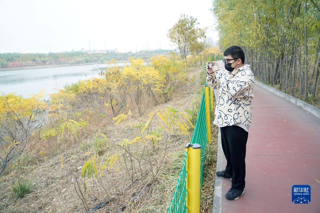 北京科技大学应届毕业生石全在所居住的青年公寓附近的公园内拍摄秋景(10月23日摄)。