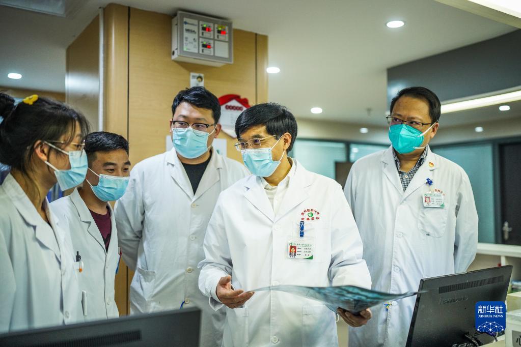 梁贵友(右二)在贵州医科大学附属医院心脏外科与规培、实习学生(左二、左一)进行交流(11月2日摄)。