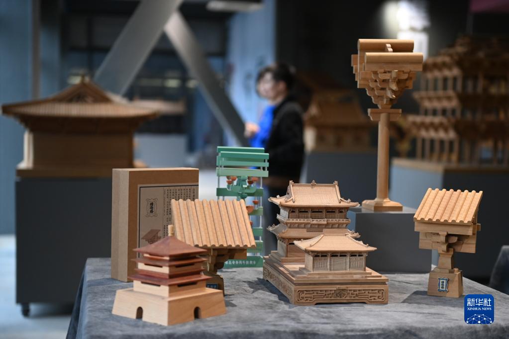 11月4日,观众在大运河1986文创园的中国榫卯技艺体验空间参观古建筑积木。