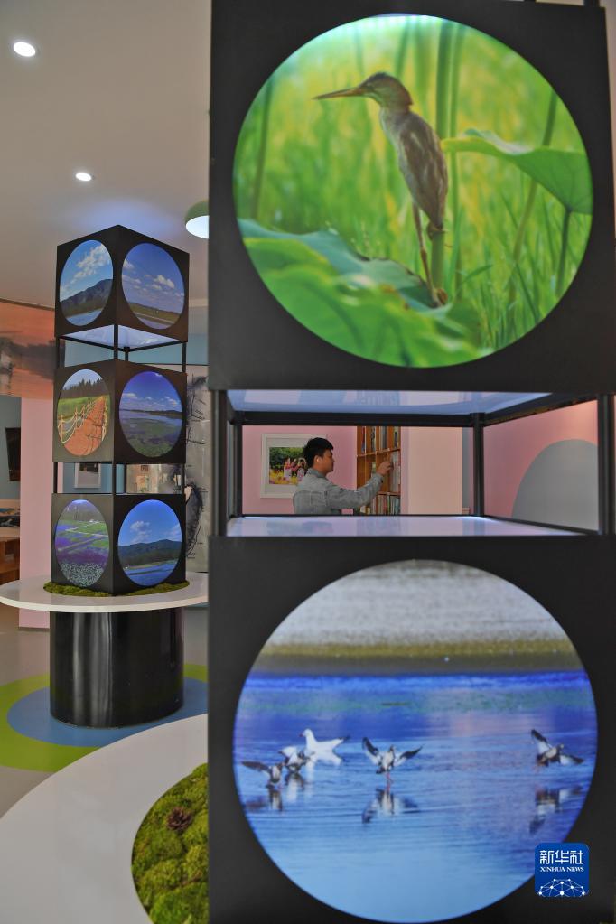 在天津蓟州州河国家湿地公园科普宣教中心,工作人员在整理科普书籍(11月2日摄)。