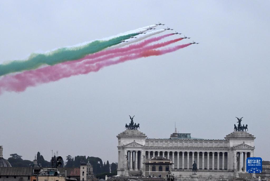 11月4日,意大利“三色箭”飞行表演队喷出象征国旗三色的烟雾飞过罗马威尼斯广场上空,庆祝国家团结日。新华社发(阿尔贝托·林格利亚摄)