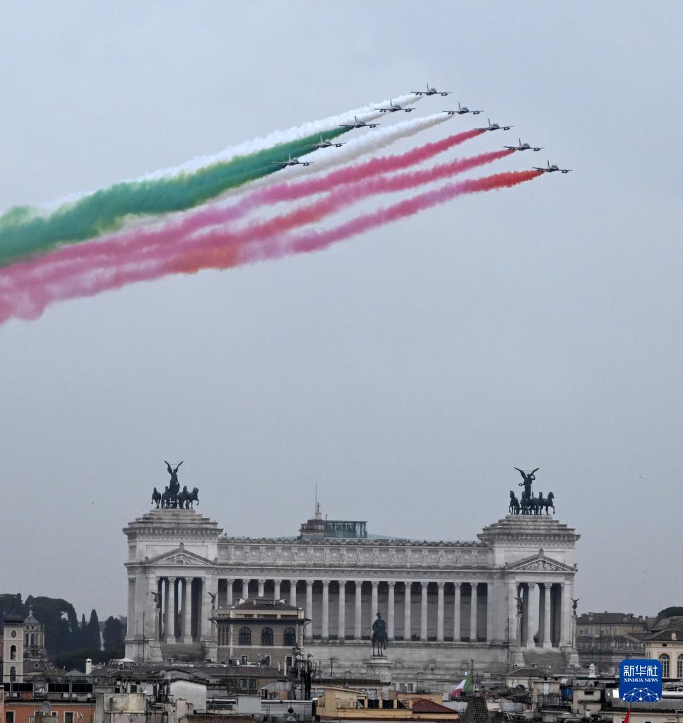 11月4日,意大利“三色箭”飞行表演队喷出象征国旗三色的烟雾飞过罗马威尼斯广场上空,庆祝国家团结日。新华社发(阿尔贝托·林格利亚摄)