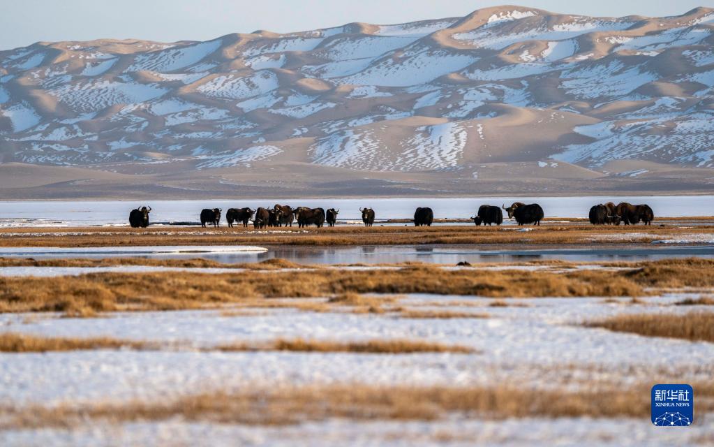 野牦牛在新疆阿尔金山国家级自然保护区内的依协克帕提湿地觅食(2019年4月2日摄)。
