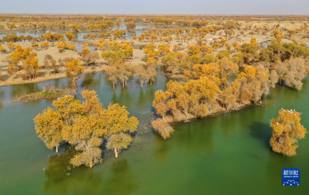 新疆尉犁县罗布淖尔国家湿地公园秋景(2022年10月31日摄,无人机照片)。