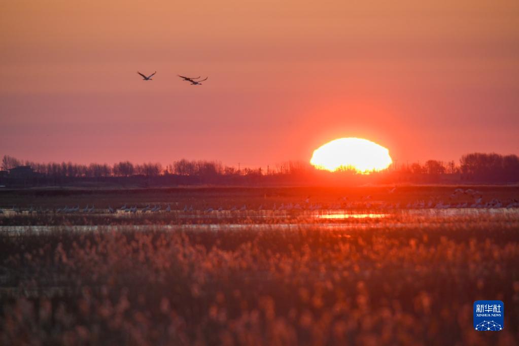 11月4日,候鸟从吉林省白城市镇赉县莫莫格国家级自然保护区上空飞过。