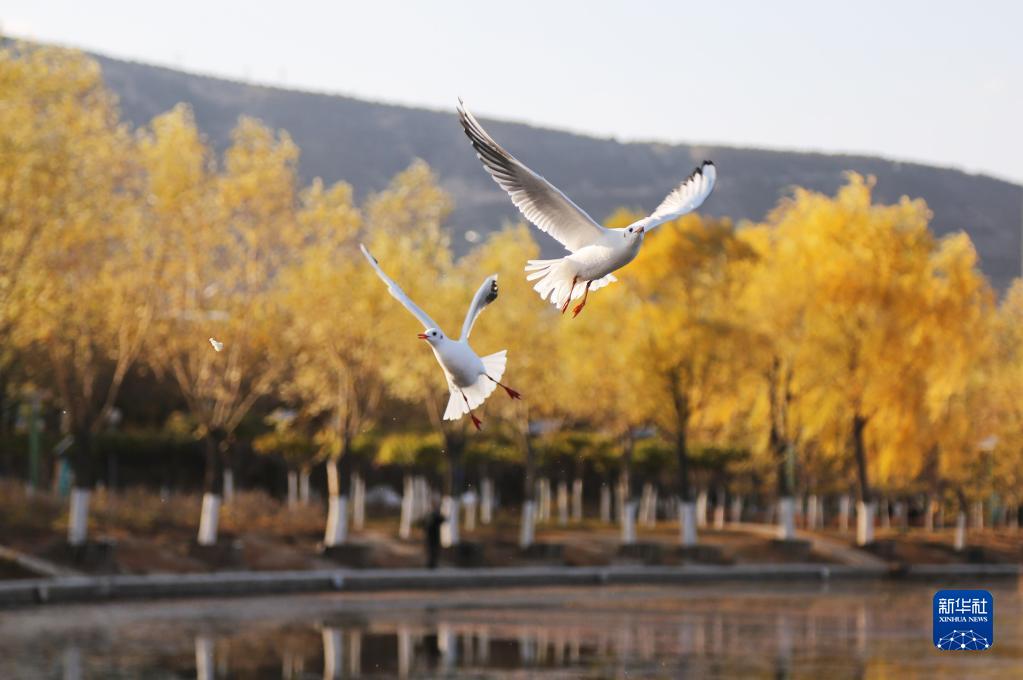 11月4日,在甘肃省定西市安定区一处公园,鸟儿在飞舞觅食。 新华社发(王克贤 摄)