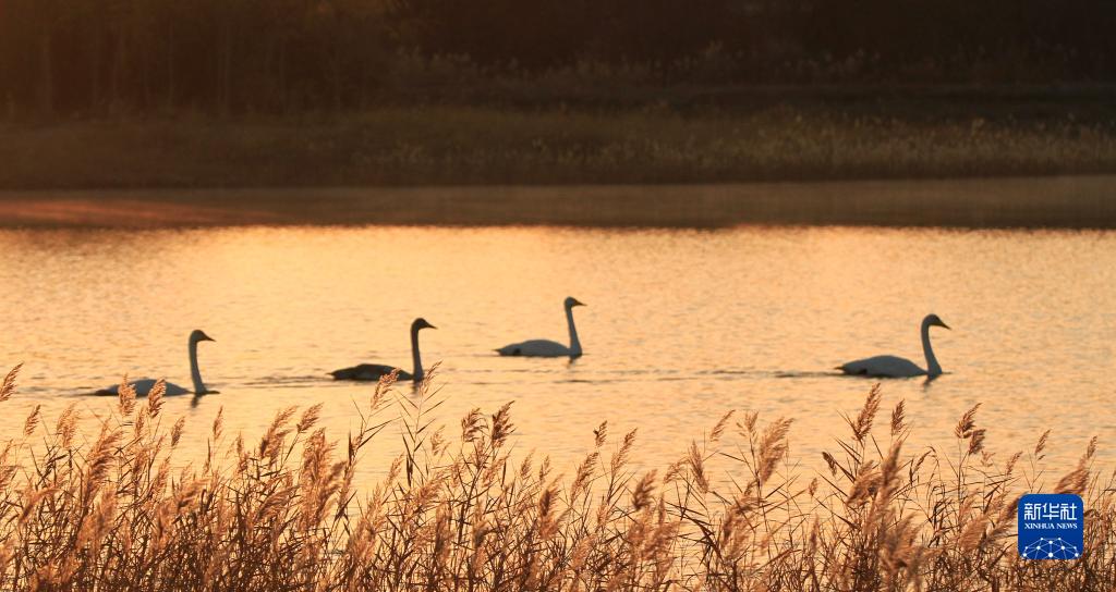 11月4日,几只白天鹅在甘肃省张掖国家湿地公园湖中栖息。 新华社发(陈礼 摄)