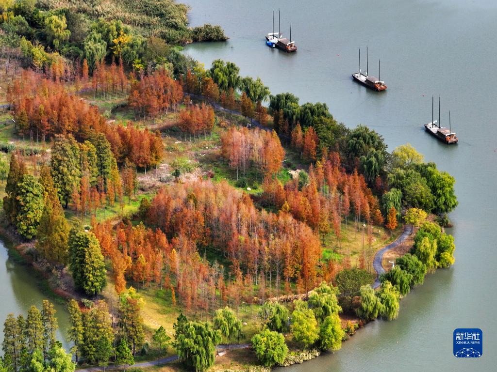 这是11月4日在江苏省扬州市运河三湾景区拍摄的秋景(无人机照片)。 新华社发(孟德龙 摄)