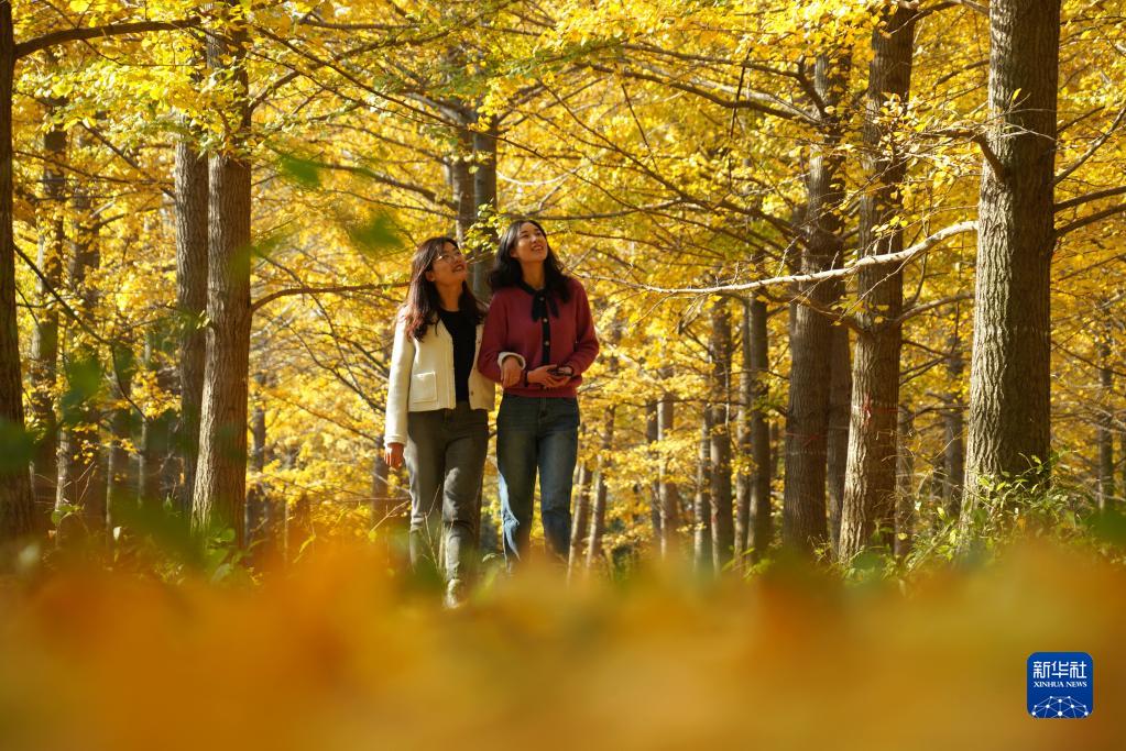11月2日,游人在山东省临沂县沂南县的银杏林间游玩赏秋。 新华社发(尹君 摄)