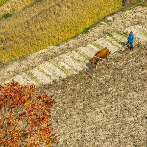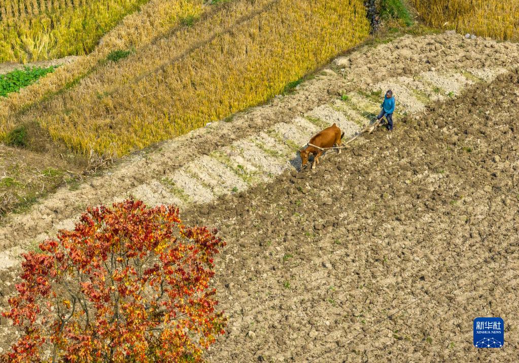 11月5日,湖北省宜昌市秭归县九畹溪镇石柱村的农民在田间犁地,为冬播冬种做准备(无人机照片)。