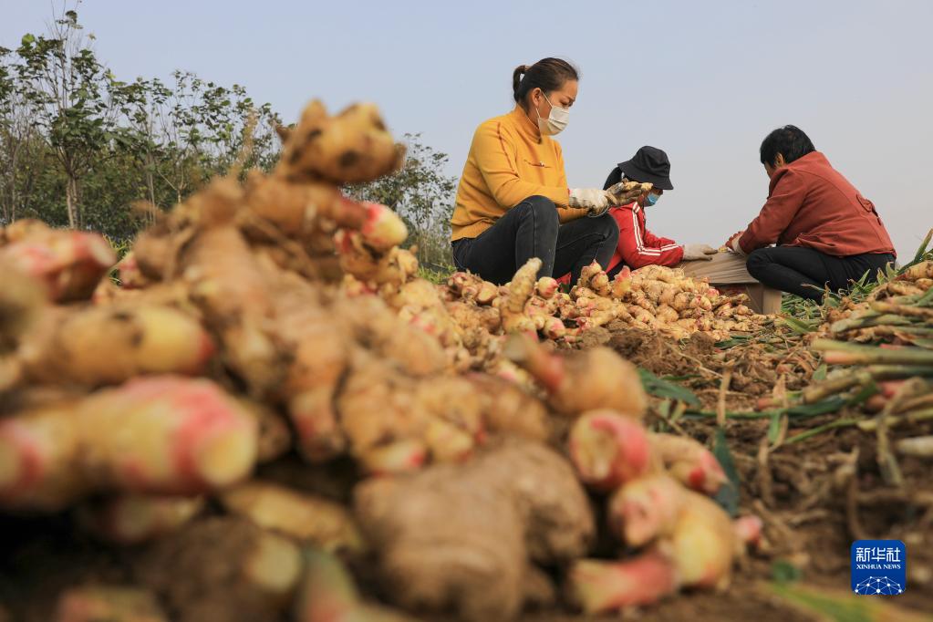 11月5日,河南省宝丰县商酒务镇柳林村村民在田间收获生姜。