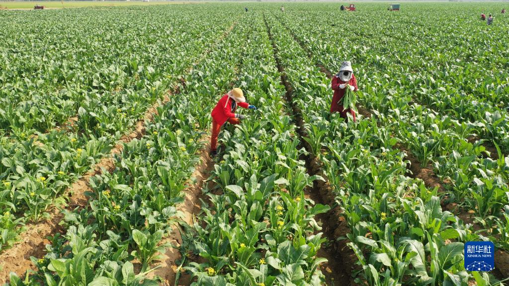 11月5日,在河南省许昌市建安区榆林乡的蔬菜基地,菜农在采收蔬菜(无人机照片)。