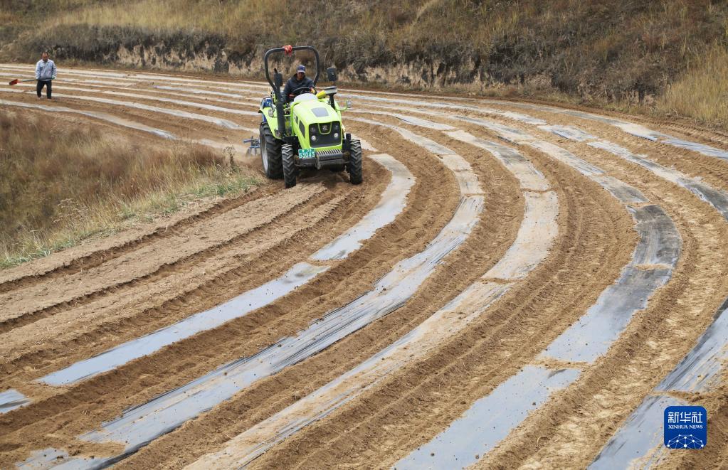 11月5日,农机手驾驶农机在甘肃省定西市安定区葛家岔镇黄家湾村覆地膜保墒。