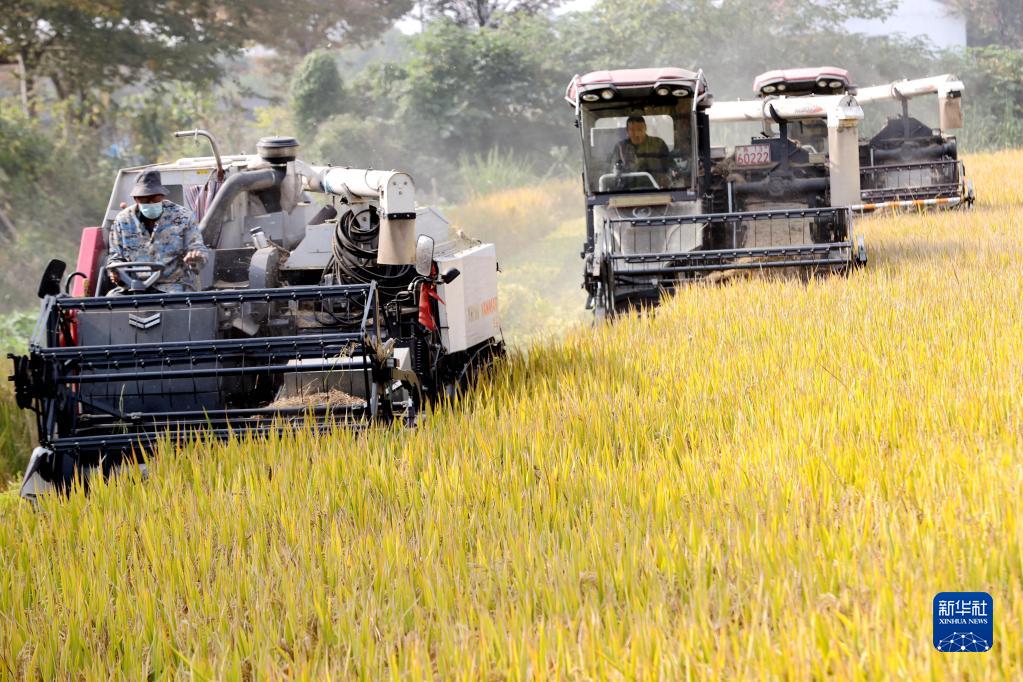 11月5日,浙江省湖州市德清县新市镇蔡界村,收割机在收割成熟的水稻。