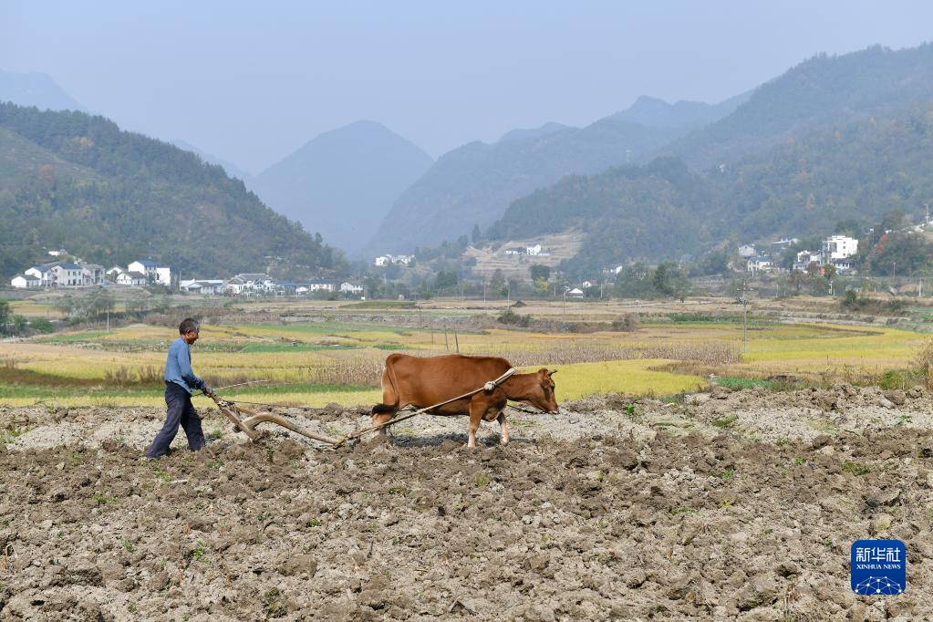 11月5日,湖北省宜昌市秭归县九畹溪镇石柱村的农民在田间犁地,为冬播冬种做准备。
