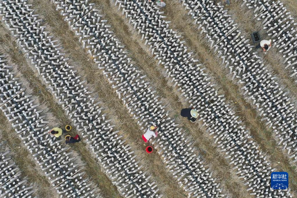 11月5日,村民在贵州省黔东南苗族侗族自治州岑巩县水尾镇新场村黑木耳种植基地劳作(无人机照片)。