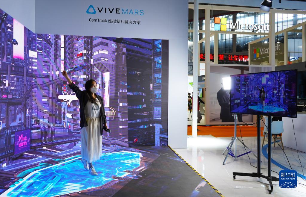 11月5日,参观者在第五届进博会技术装备展区人工智能专区体验虚拟制片解决方案。