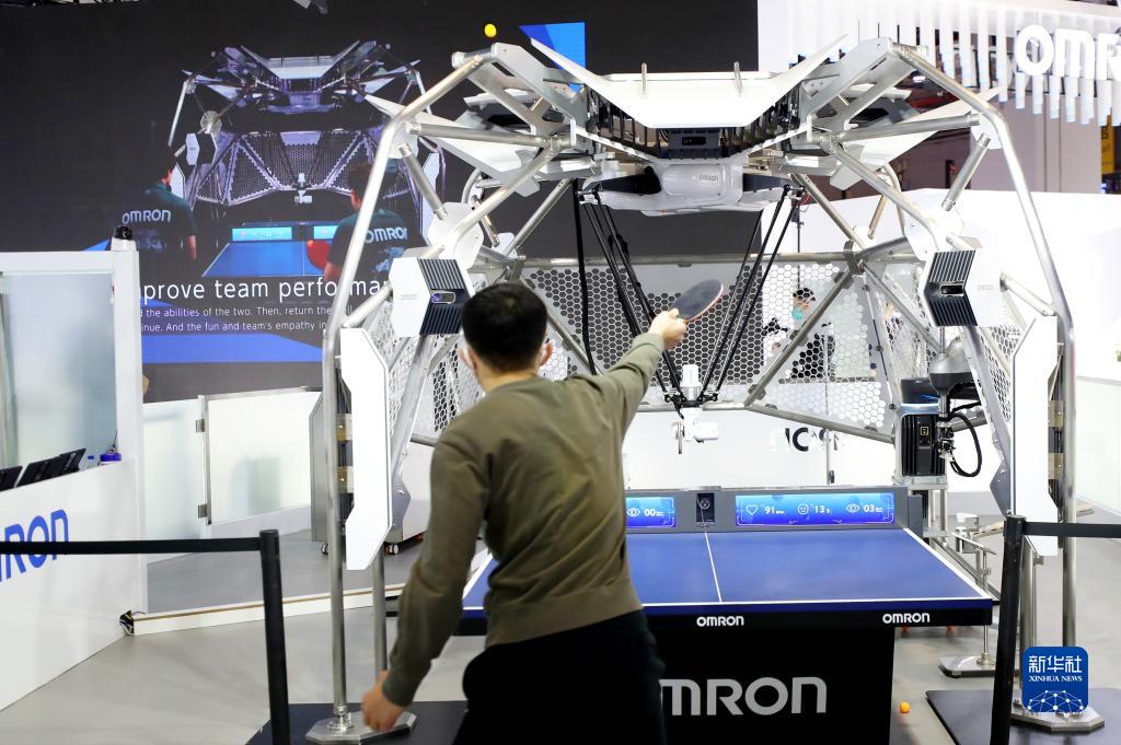 11月5日,参观者在第五届进博会技术装备展区与“乒乓球机器人”互动。