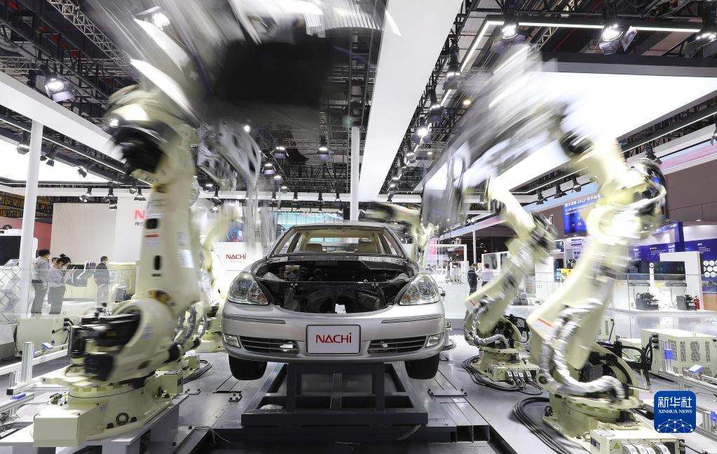 11月5日在第五届进博会技术装备展区拍摄的汽车装配作业演示画面。