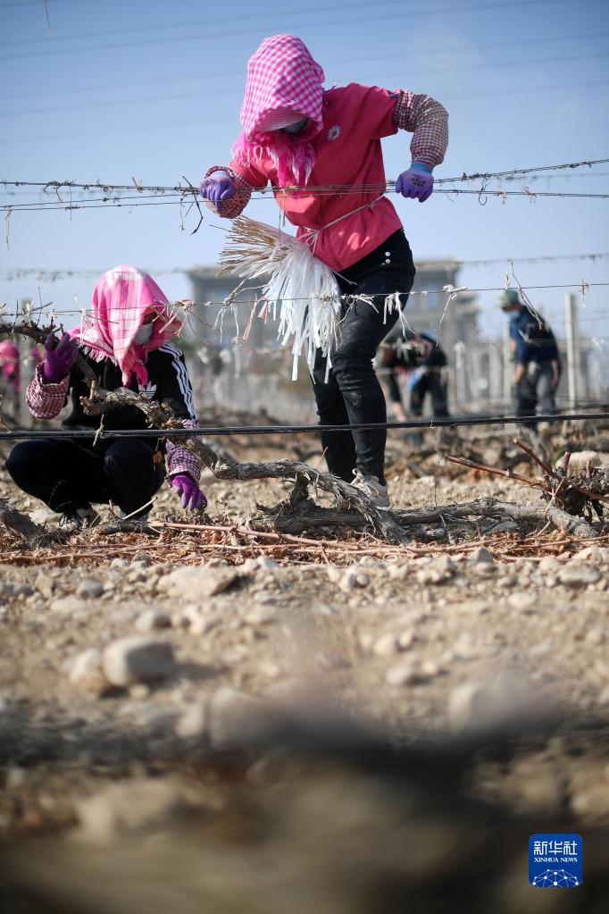 近日,随着气温降低,宁夏贺兰山东麓优质酿酒葡萄产区数十万亩酿酒葡萄迎来“冬眠季”。当地群众在田间地头下架、绑藤、埋藤,帮助葡萄藤进入“冬眠”状态。冬藏埋土、春季展藤,以避免低温冻伤葡萄藤。