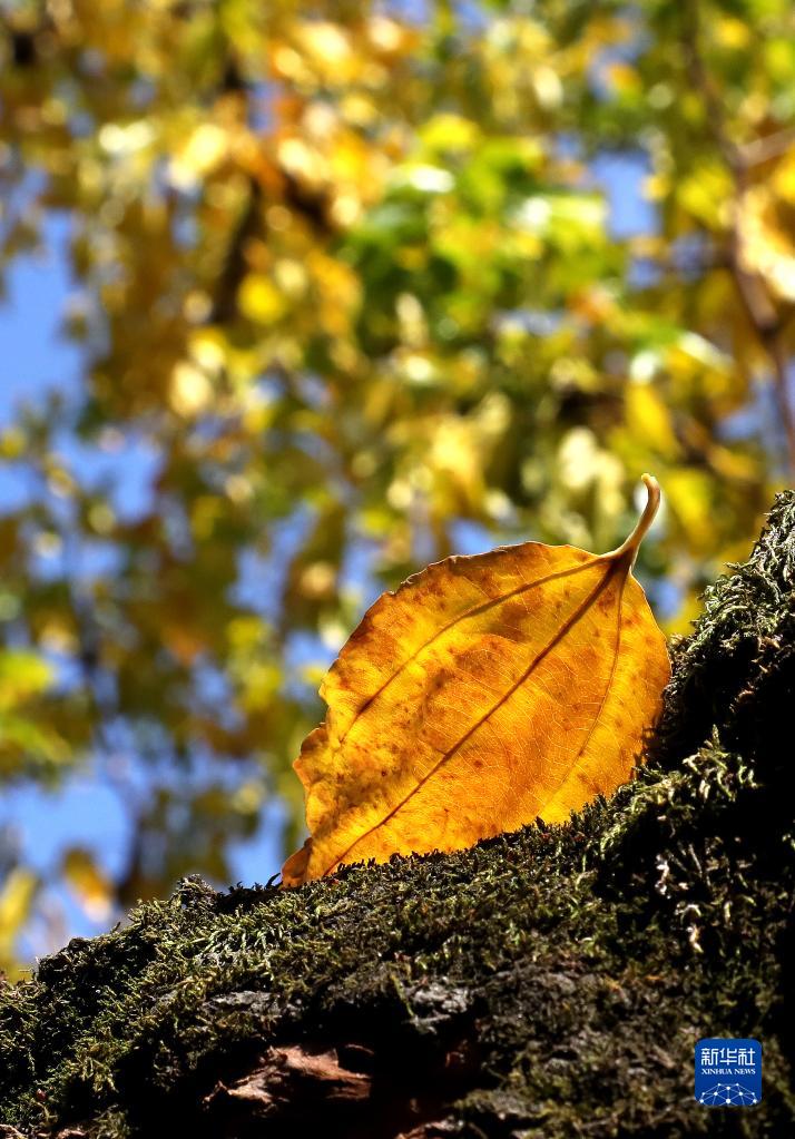 10月31日,在江苏苏州怡园内,一片黄叶飘落在树干上。