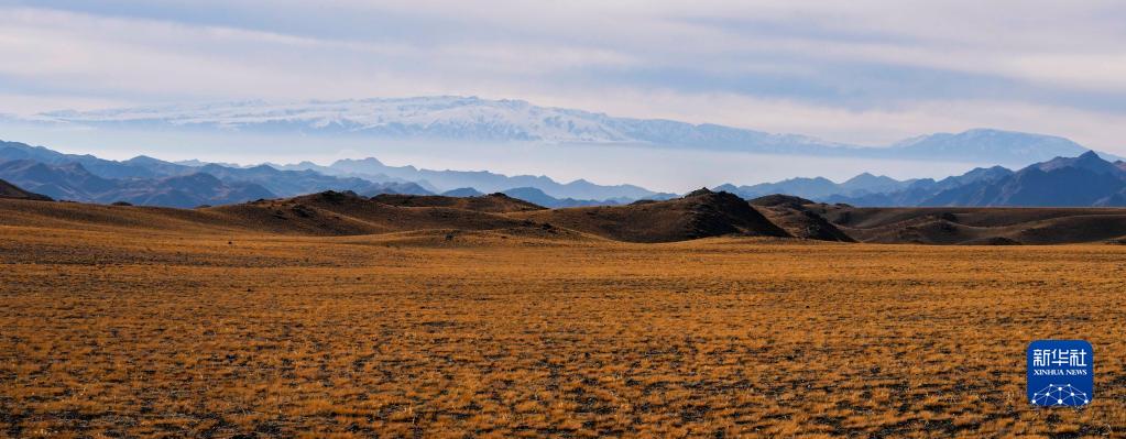 新疆裕民县巴尔鲁克山冬季牧场,远山覆雪,牧草秋黄(11月4日摄)。
