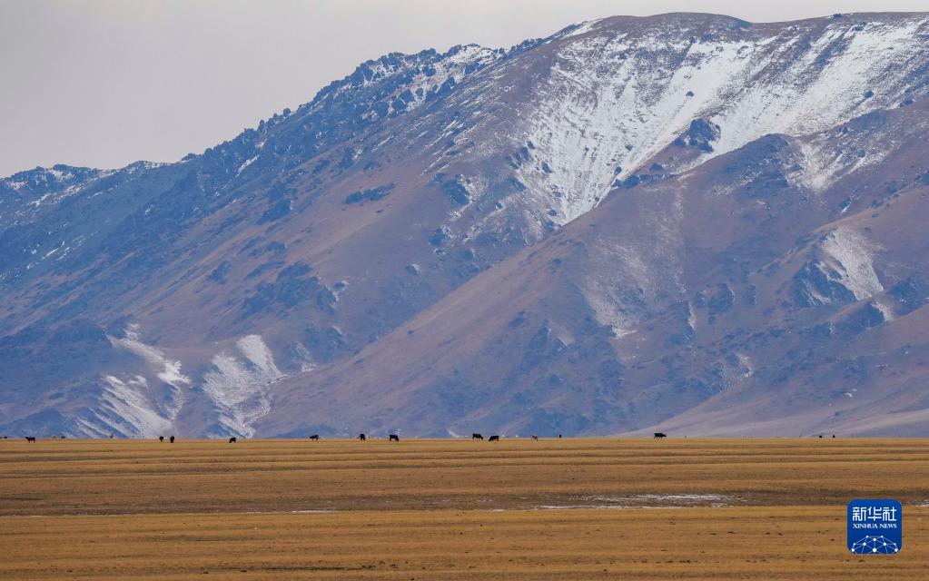 牲畜在新疆裕民县巴尔鲁克山冬季牧场上觅食(11月4日摄)。