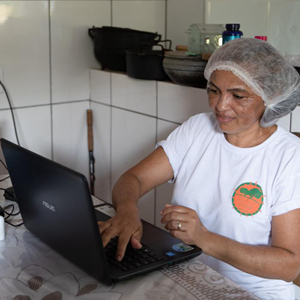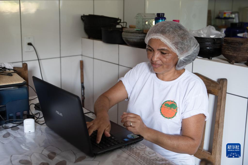 10月4日,在巴西托坎廷斯州马利亚迪尼亚,水果加工厂工人马莱娜在家中使用新买的电脑。