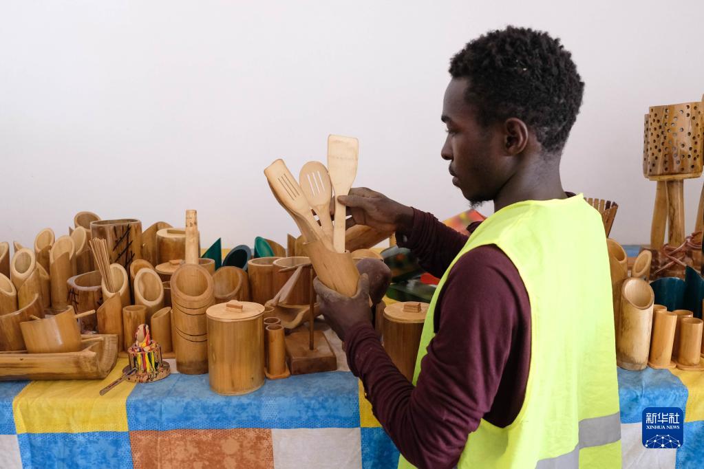10月26日,在乌干达首都坎帕拉,乌干达竹子协会的工作人员展示竹制器具。