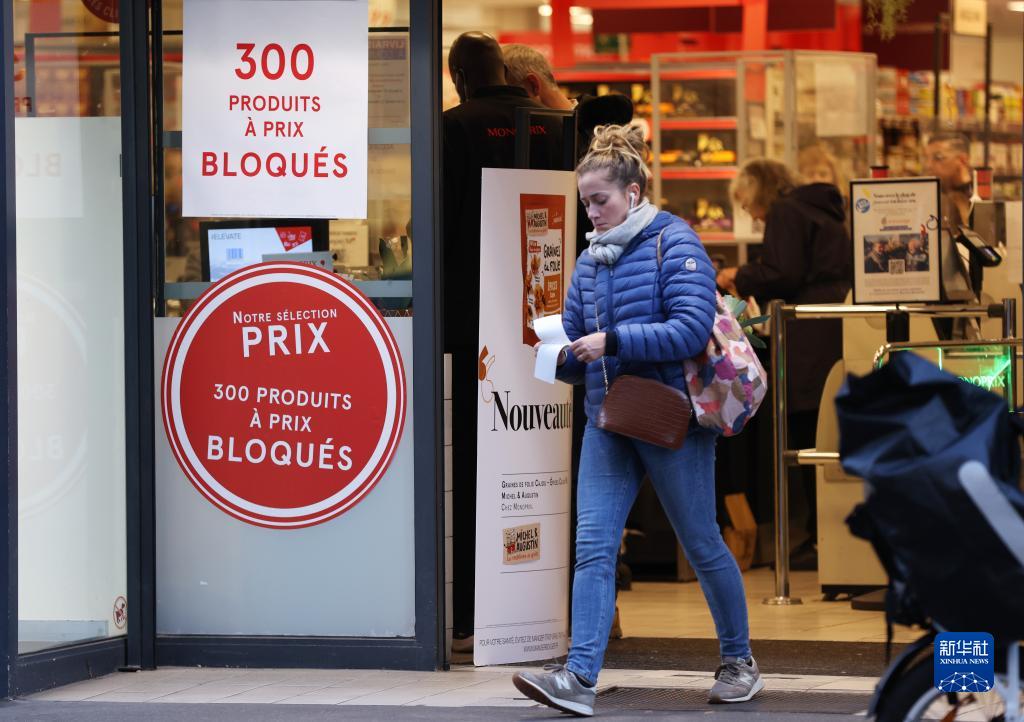 11月7日,在法国巴黎一家贴有“我们精选300种限价商品”字样的超市外,一名女子检查手里的购物小票。