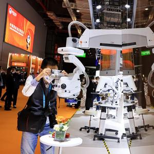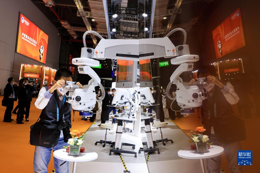 11月6日,参观者在第五届进博会蔡司展台体验眼科导航手术显微镜。