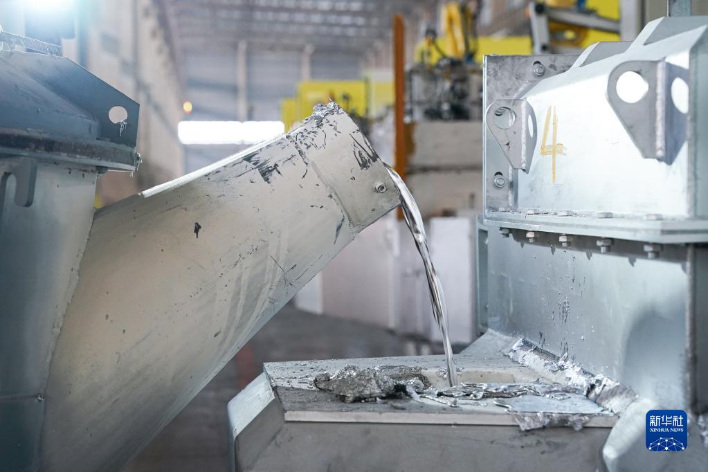11月7日,在安徽省马鞍山市含山县三基轻合金成型科技有限公司,工人操作叉车向压铸机的燃气保温炉内添加铝液。