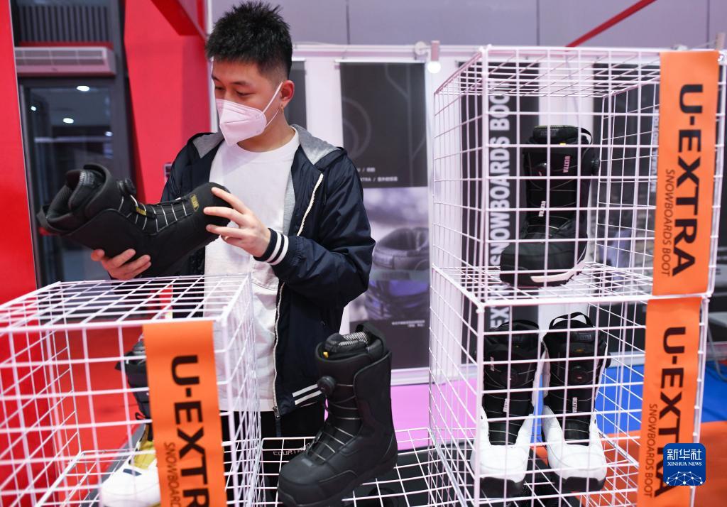 11月8日,参观者在第五届进博会上了解一款滑雪鞋。