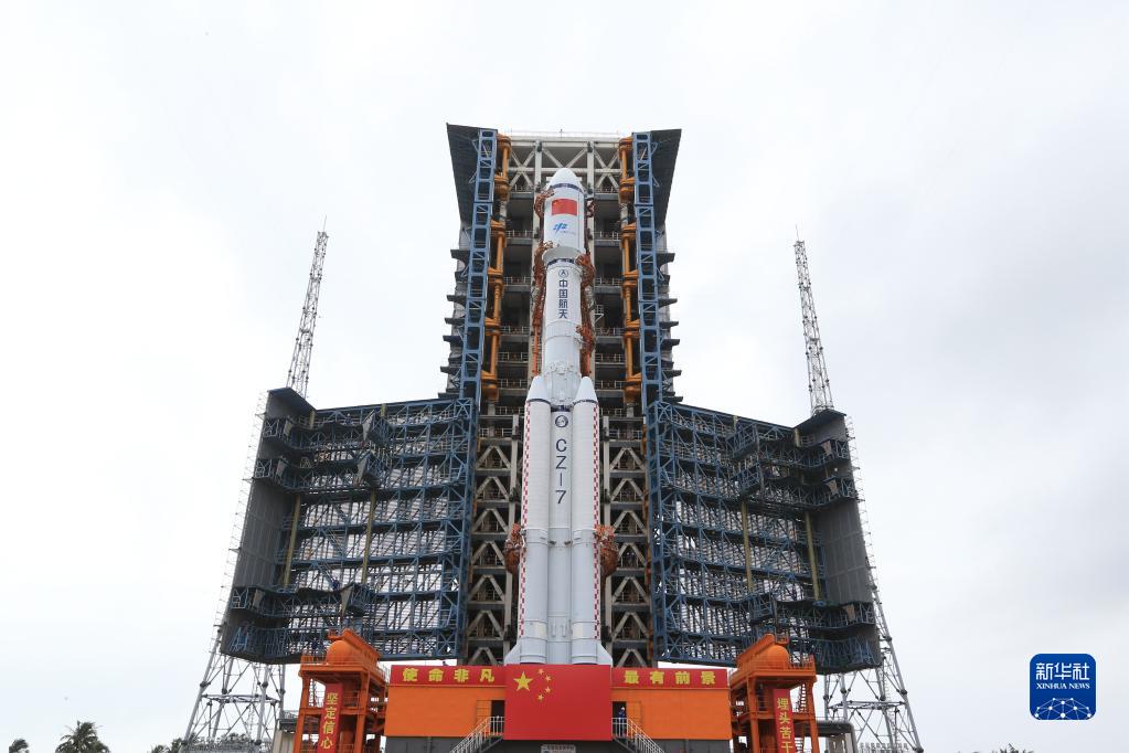 11月9日,天舟五号货运飞船与长征七号遥六运载火箭组合体转运至发射塔架。