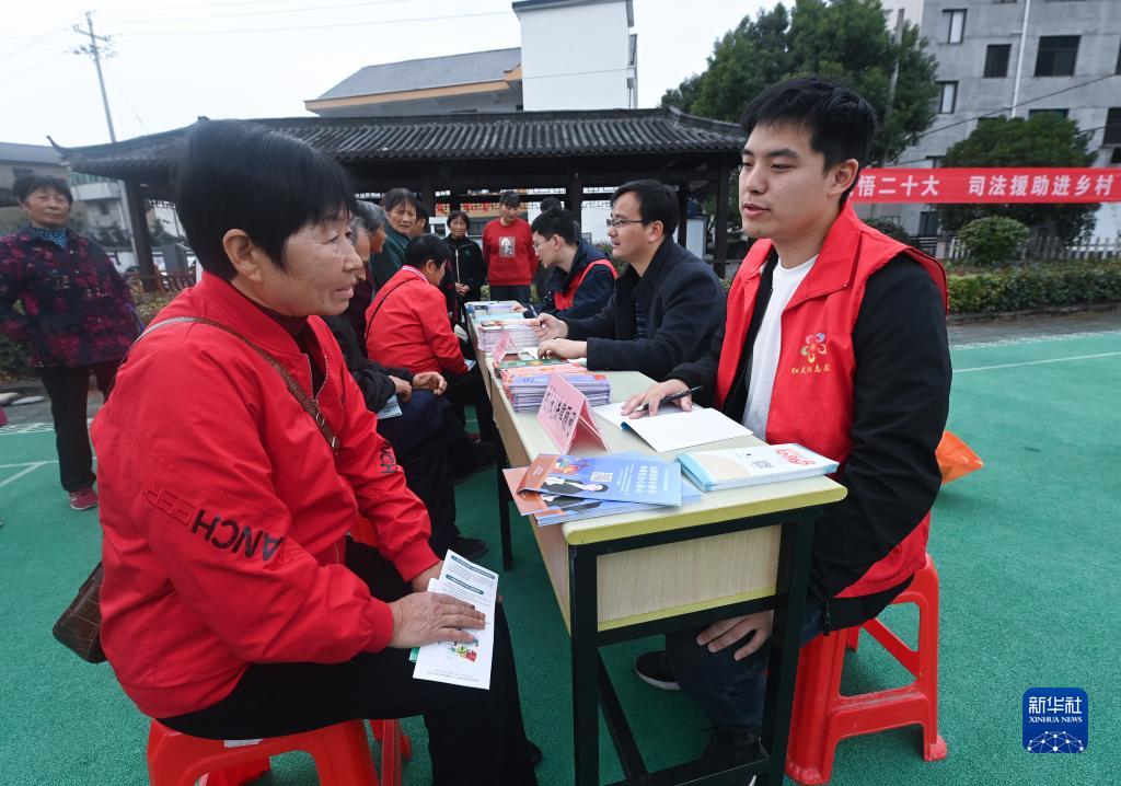 11月9日,在杭州市临安区太阳镇上太阳村,法律顾问赵黄炳(右一)解答村民咨询。