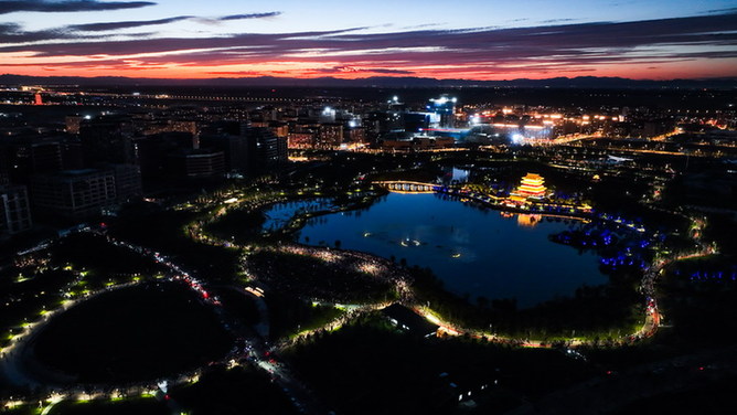 夜幕下的雄安新区金湖公园,静谧而美好,蜿蜒的灯带勾勒出湖形,景观、建筑依水为景与远处的容东片区建筑群体构成连绵起伏的城市风景线。