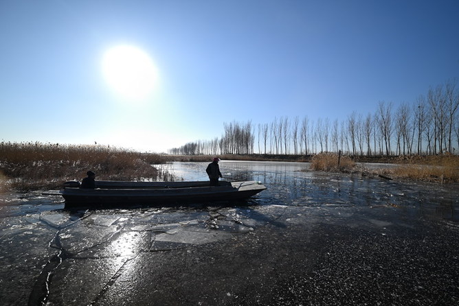 冬天的白洋淀铅华尽洗。澄澈蔚蓝的天空,结冰的湖面,巡航的破冰船,共同演绎这破碎的0°C美景。