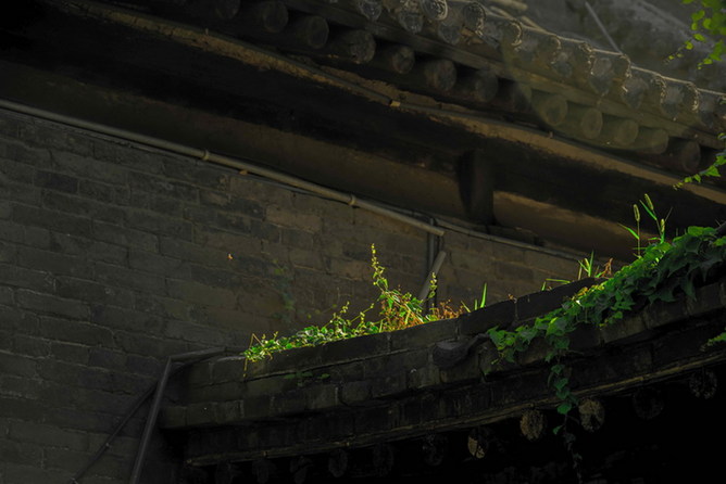墙头瓦檐,新生的嫩绿在百年的时光里舒展,阳光穿过错落的屋檐,像一束追光,让新生命变成主角。