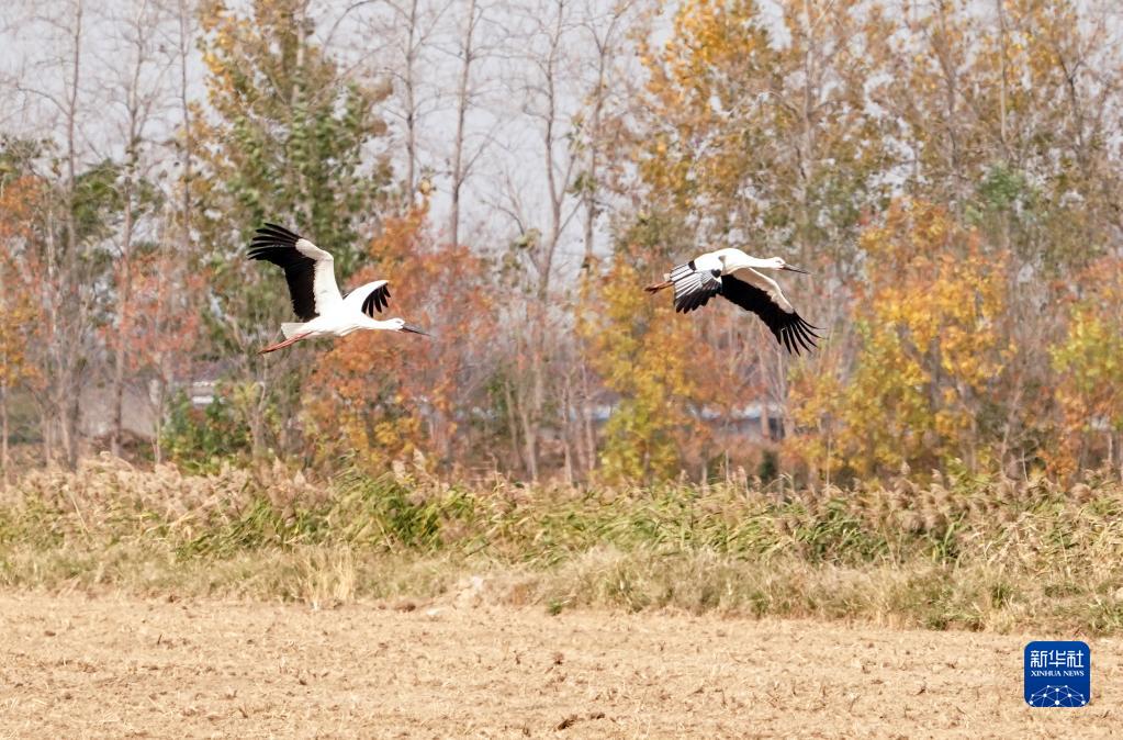 两只东方白鹳飞翔在盐城湿地珍禽国家级自然保护区附近的村庄(11月8日摄)。