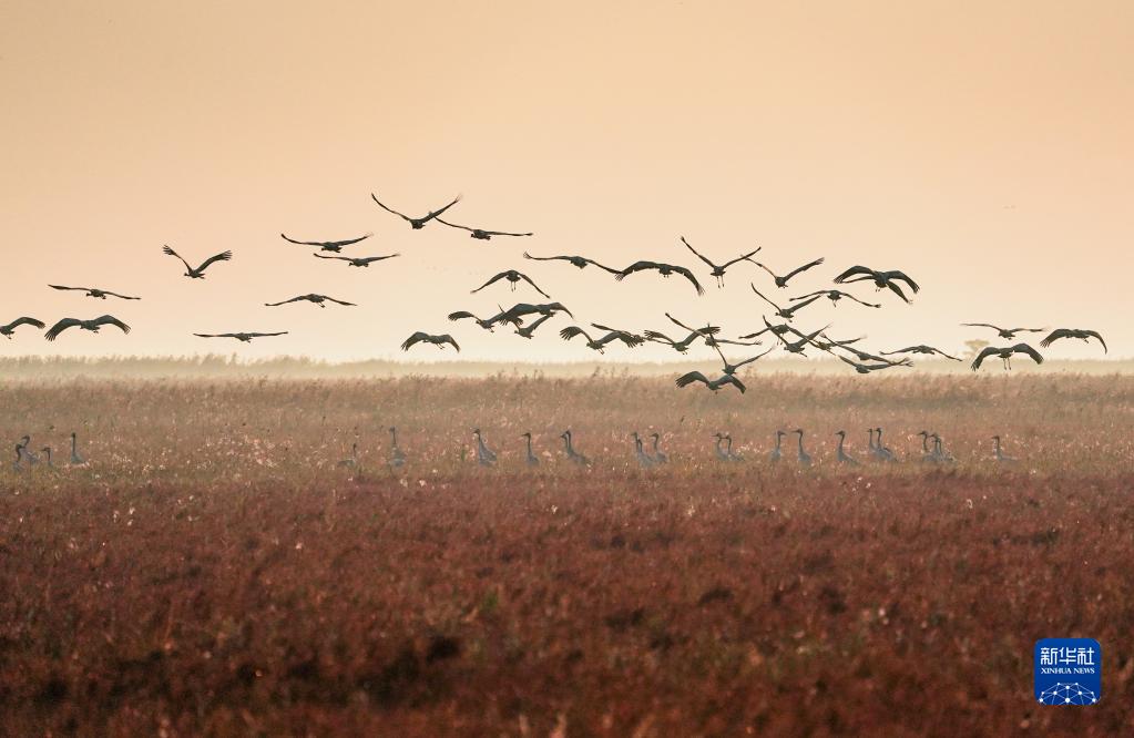 一群灰鹤在盐城湿地珍禽国家级自然保护区飞翔(11月8日摄)。