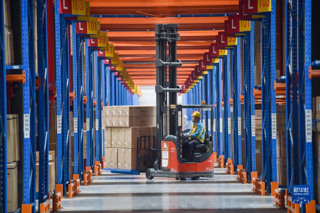 11月10日,在位于江苏省南京市江宁区的苏宁华东物流中心,工人驾驶叉车搬运商品。