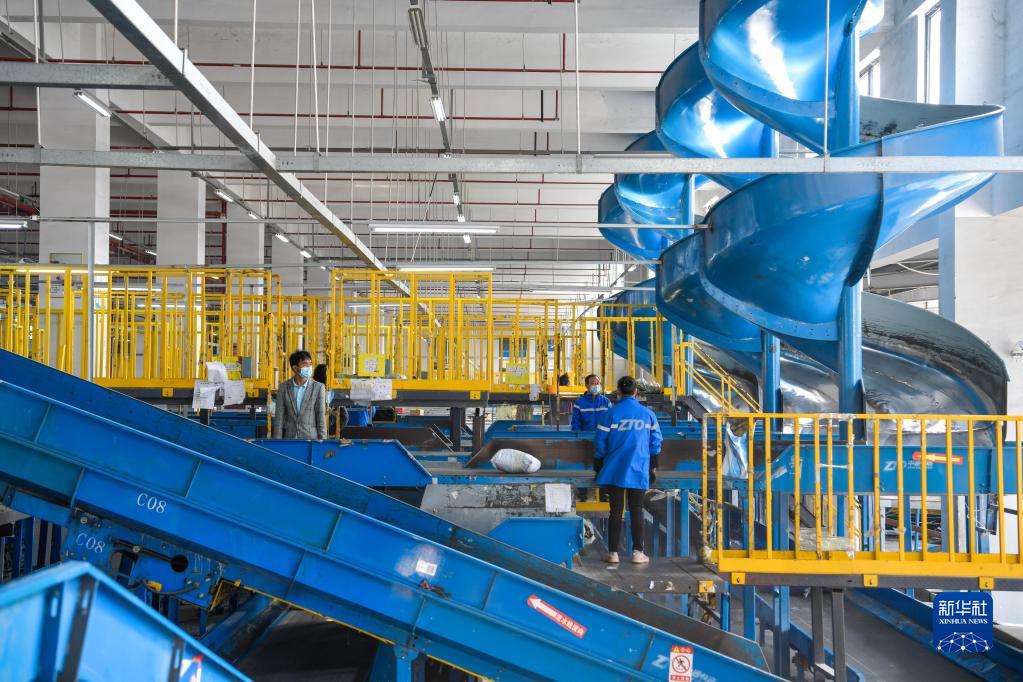 11月10日,工作人员在位于贵州省龙里县的贵州快递物流园一家快递分拨中心分拣快递。